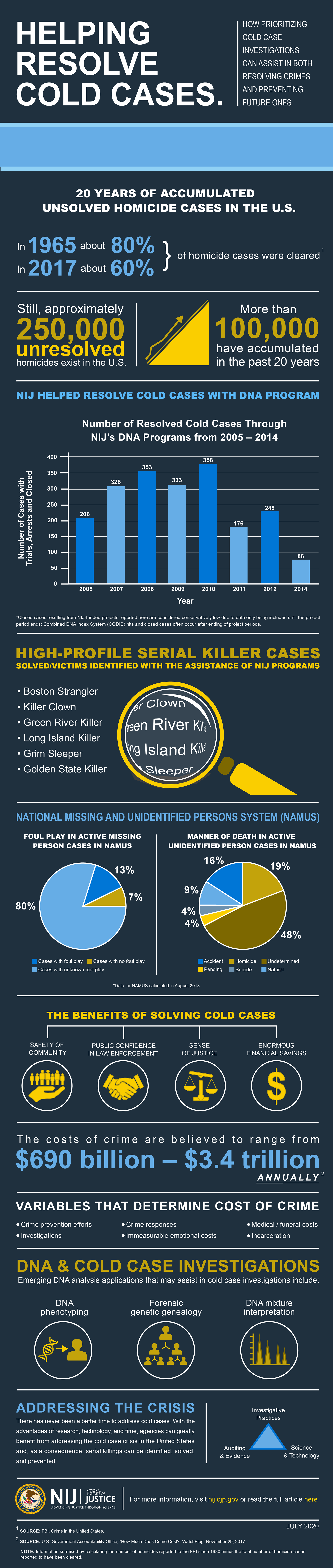 infographic summarizing NIJ's article about prioritizing cold case investigations and NIJ's involvement in helping solve cold cases
